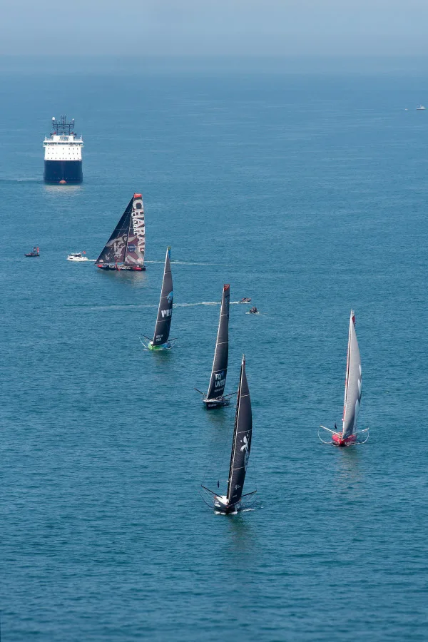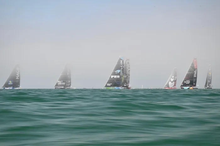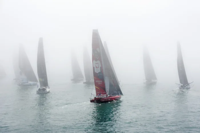 Dès la ligne franchie, les IMOCA se sont élancés lentement dans une atmosphère ouatée, la brume renforçant le caractère irréel de ce départ. Portés par un léger souffle de 4 à 6 nœuds, ils avancent toujours dans un calme trompeur, où la tension reste constante : chaque marin sait que la moindre erreur de placement peut condamner son bateau à subir le courant et perdre un temps précieux. « Ces premiers milles s’annoncent un peu incertains, avec plus de courant que de vent, ce qui impose un état d’esprit particulier dès le début. Ça commence calmement, mais pas tant que ça, car si on se laisse surprendre, on peut vite se retrouver en difficulté », analysait Thomas Ruyant (VULNERABLE).